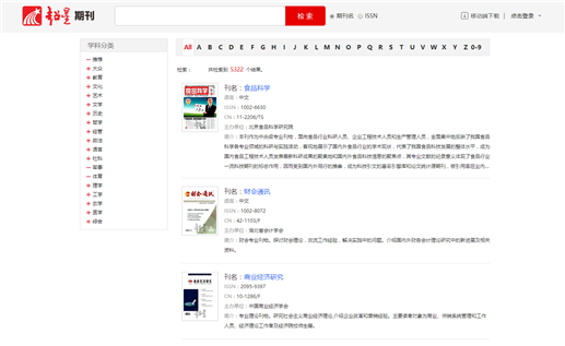 点击搜索框下方“期刊导航”链接,进入期刊导航页面。点击左侧一级分类或首字母分类的链接,可以看到属于相应类别的期刊。在页面顶部的搜索框输入刊名关键词或完整issn号可以直接检索相关刊物。