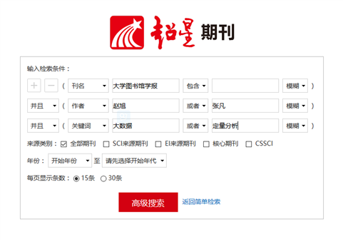 例:检索《大学图书馆学报》一刊内,由赵旭或者张凡发表的关于大数据或定量分析相关的文献