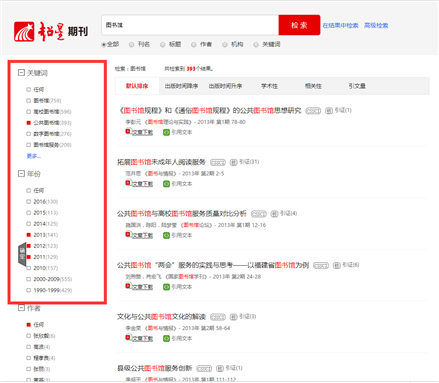 操作方法:1)检索“图书馆”关键词 2)选择关键词分面 3)选择年份分面 5)点击确定 6)选择重要期刊分面 7)点击确定开始检索